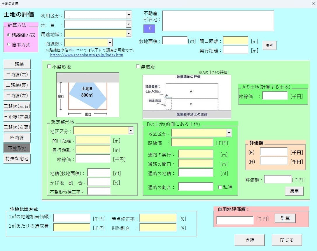 土地評価路線価×面積の簡易計算不整形地・借地権等の補正に対応