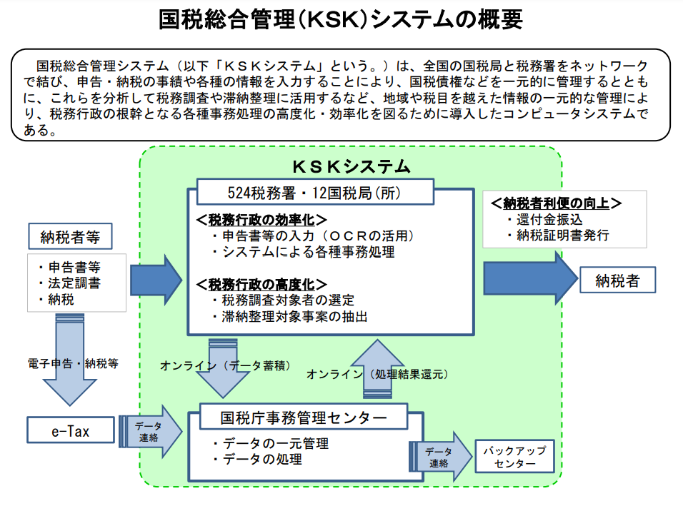 KSK(Kokuzei Sogo Kanri)システムとは、全国の国税局と税務署をネットワークで結び、納税者の申告内容や納税状況を一元管理するシステムです。
