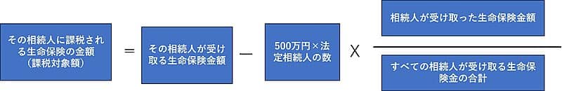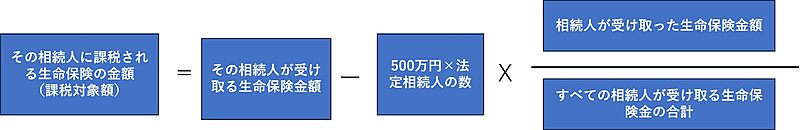 少し複雑ですが、生命保険の課税金額は、その相続人が受け取った保険金額の割合で控除した金額が課税されますので、以下の式に従う必要があります。(これは、生命保険の受取人が法定相続人だけとは限らないためです。)