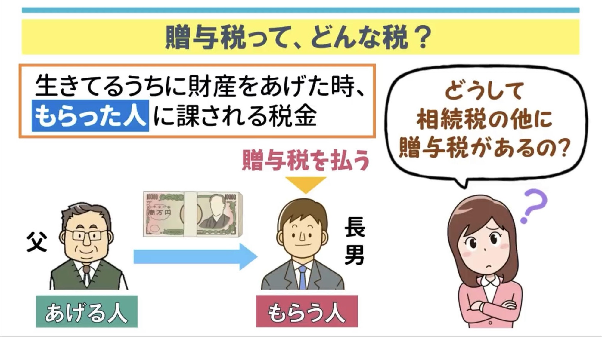 次に、贈与税についてです。 贈与税とは、**「生きているうちに財産をあげた時、もらった人に課される税金」**です。