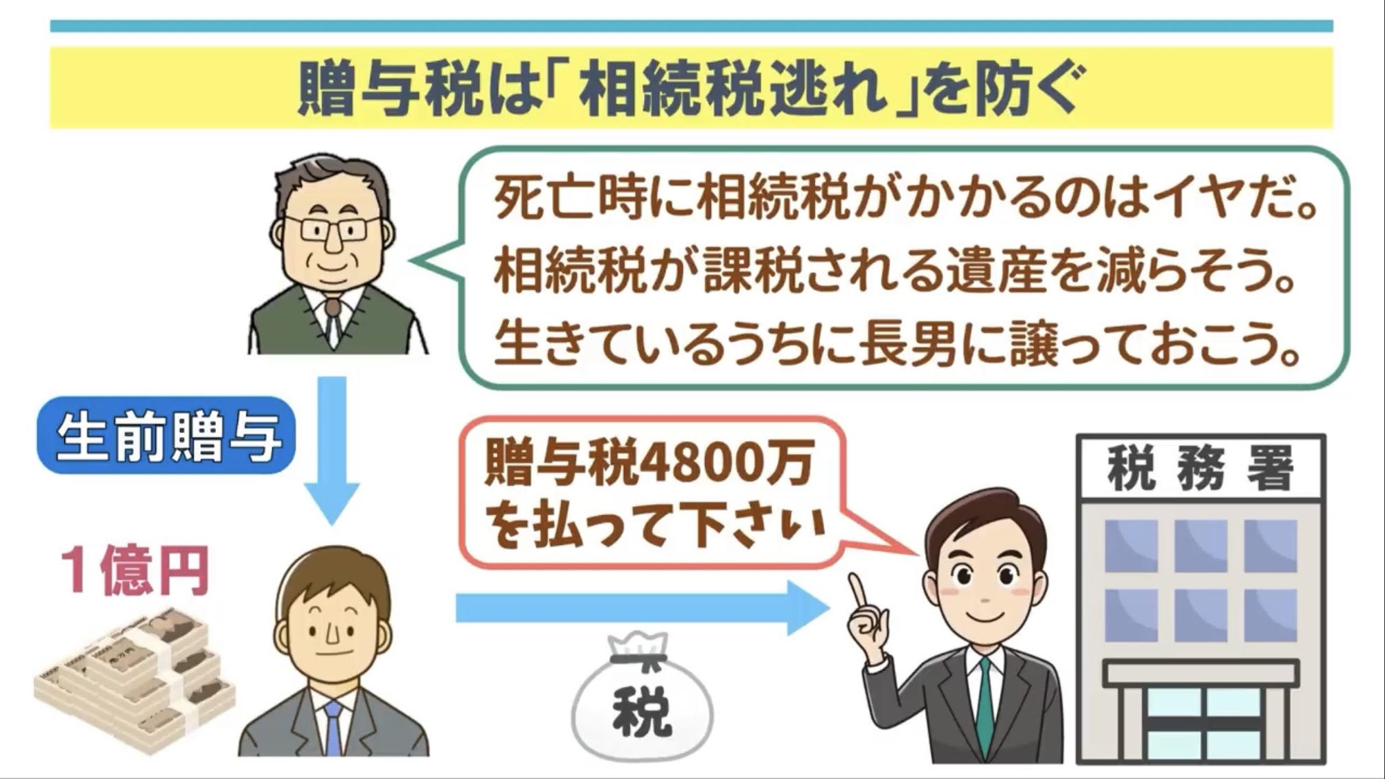 資産家は、自分が亡くなる直前に全財産を子供に渡してしまうでしょう。そうすれば、手元に遺産がなくなるため、相続税を支払わなくて済みます(=相続税逃れ)。 国としては、これでは「富の再分配」が機能しなくなってしまいます。