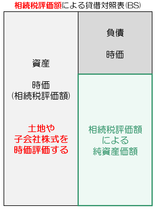 貸借対照表(BS)に載っている資産を、すべて「相続税評価額(時価)」に置き換える必要があります。