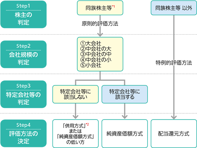 ※1:同族株主等であっても、一定の条件かつ取得後の議決権割合が5%未満などの株主は配当還元方式で評価します(役員を除く)。