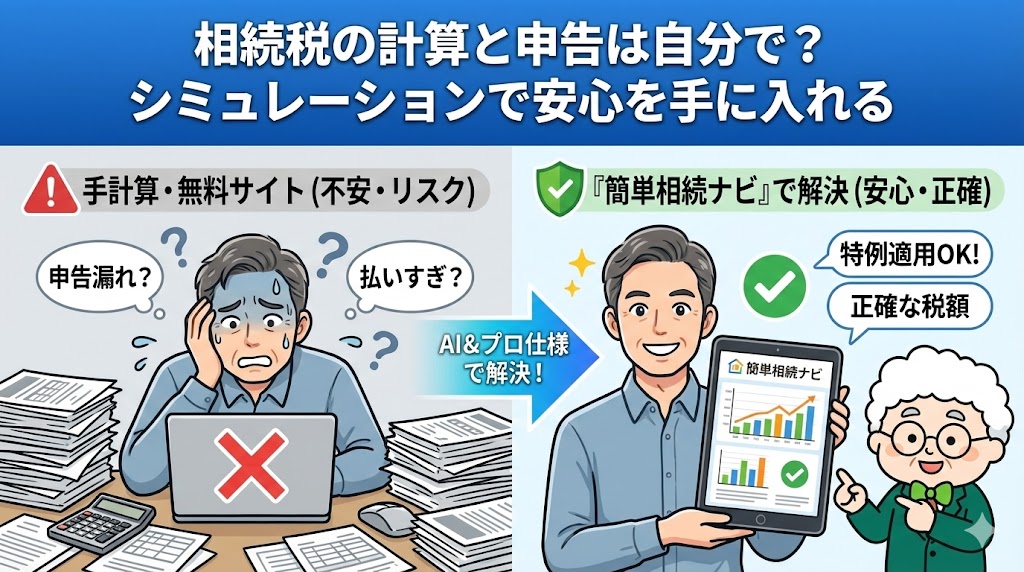 「相続税の計算、専門家に頼むと高いし、自分でできないかな?」「税理士報酬で50万円以上かかるって本当? なんとか節約したい……」 相続税の申告は複雑だと言われていますが、実は基本的な知識と正しいツールさえあれば、自分で行うことは十分に可能です... -