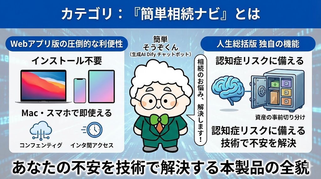 なぜ『簡単相続ナビ』が選ばれるのか?その理由を徹底解説します。インストール不要で、Macやスマホからすぐに使える「Webアプリ版」の圧倒的な利便性をご紹介。さらに、認知症リスクに備える「人生総括版」独自の「資産の事前切り分け」機能など、あなたの不安を技術で解決する本製品の全貌をご覧ください。