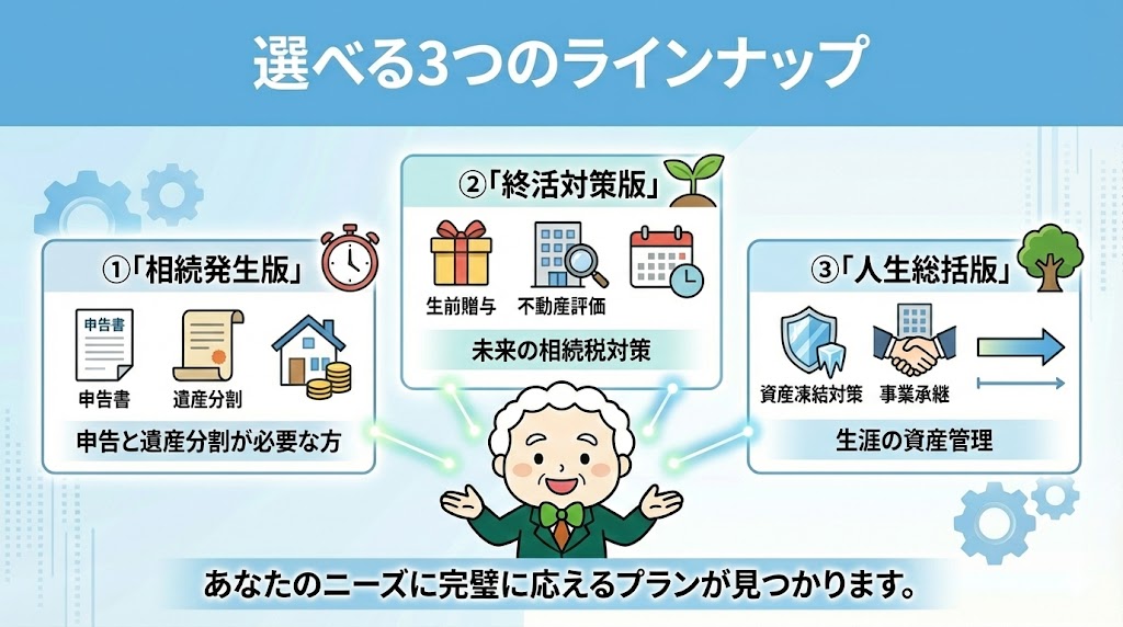 ②「終活対策版」:生前贈与や不動産評価など、未来の相続税対策を始めたい方。