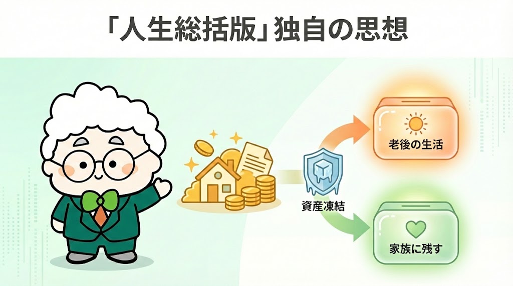 本製品の核心が「人生総括版」 です。その思想は、単なる相続税計算を超えています。最大の目的は、認知症による「資産凍結」から家族を守ること。「資産の事前切り分け」機能により、「老後を生活する財産」と「家族に残す財産」をシステム上で明確に管理。これにより資産凍結を法的に回避し、残された家族が安心して介護にも臨める環境を築きます。