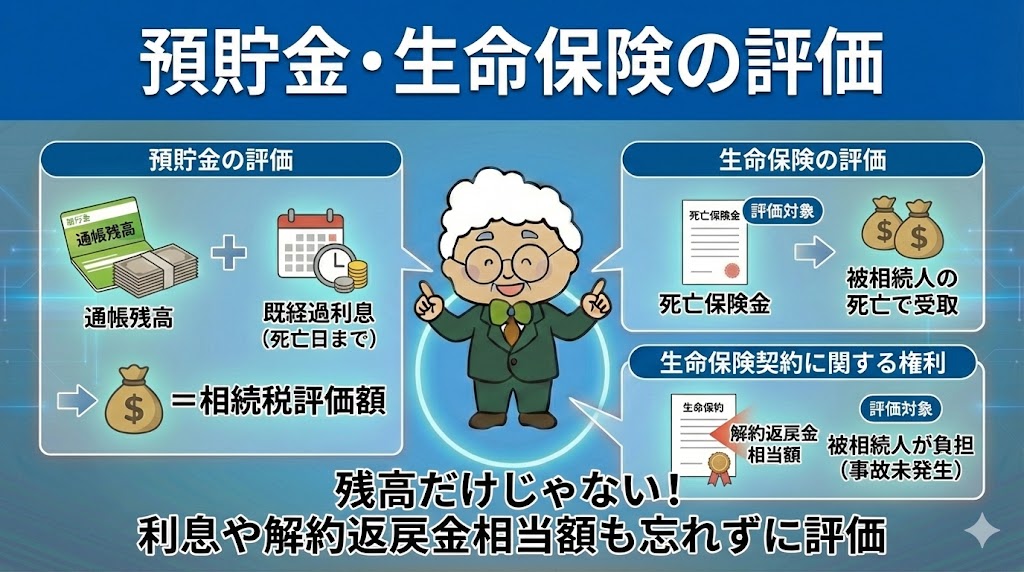 預貯金の相続税評価は、通帳の残高だけではありません。死亡日までに発生している「既経過利息」も計算して加える必要があります。また、生命保険についても、被相続人が亡くなったことで支払われる「死亡保険金」だけでなく、被相続人が保険料を負担していた(まだ保険事故が起きていない)契約の「生命保険契約に関する権利(解約返戻金相当額)」の評価についても解説します。