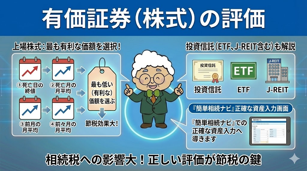 上場株式の相続税評価は、単に「亡くなった日の株価」だけで決まるわけではありません。「死亡日の終値」「死亡月の月平均」「前月の月平均」「前々月の月平均」の4つの中で、最も低い(有利な)価額を選ぶことができます。この有利なルールの詳細や、投資信託(ETF、J-REIT含む)の評価方法について解説し、『簡単相続ナビ』での正確な資産入力へ導きます。