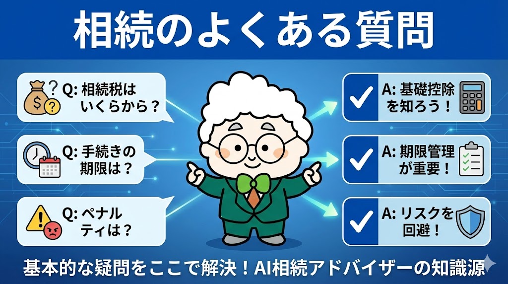 「相続税はいくらから?」「手続きの期限は?」「ペナルティは?」など、相続に関して皆様から寄せられる一般的な「よくある質問」をQ&A形式でまとめました。基本的な疑問をここで解決し、相続の全体像を掴んでください。AI相続アドバイザーの知識源にもなっています。