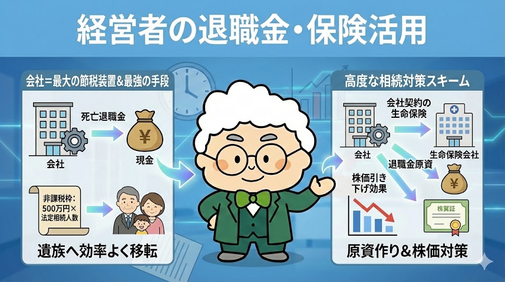 経営者にとって、会社は最大の「節税装置」になり得ます。特に「死亡退職金」は、「500万円×法定相続人の数」という非課税枠が使え、現金を効率よく遺族に移転できる最強の手段の一つです。会社契約の生命保険を活用して退職金原資を作り、同時に株価引き下げ効果も狙う、経営者ならではの高度な相続対策スキームを解説します。
