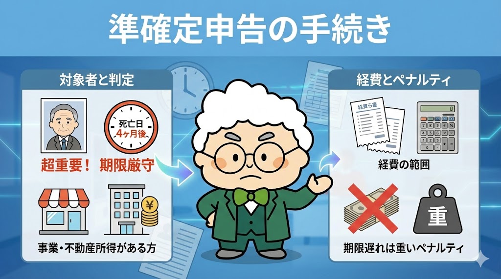 亡くなった方に事業所得や不動産所得がある場合、相続人は「死亡を知った日の翌日から4ヶ月以内」に、故人の代わりに行う確定申告(準確定申告)が必要です。通常の確定申告とは期限も手続きも異なります。このカテゴリでは、申告が必要なケースの判定、経費の範囲、そして期限に遅れた場合の重いペナルティについて詳しく解説します。