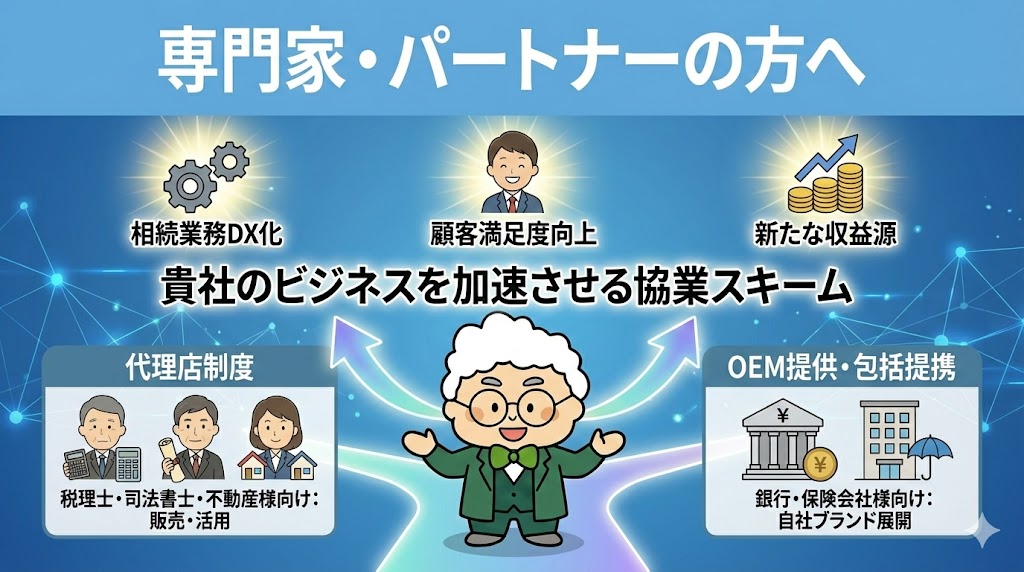 相続業務のDX化、顧客満足度の向上、そして新たな収益源の確保へ。貴社のビジネスを加速させる協業スキームについて発信します。