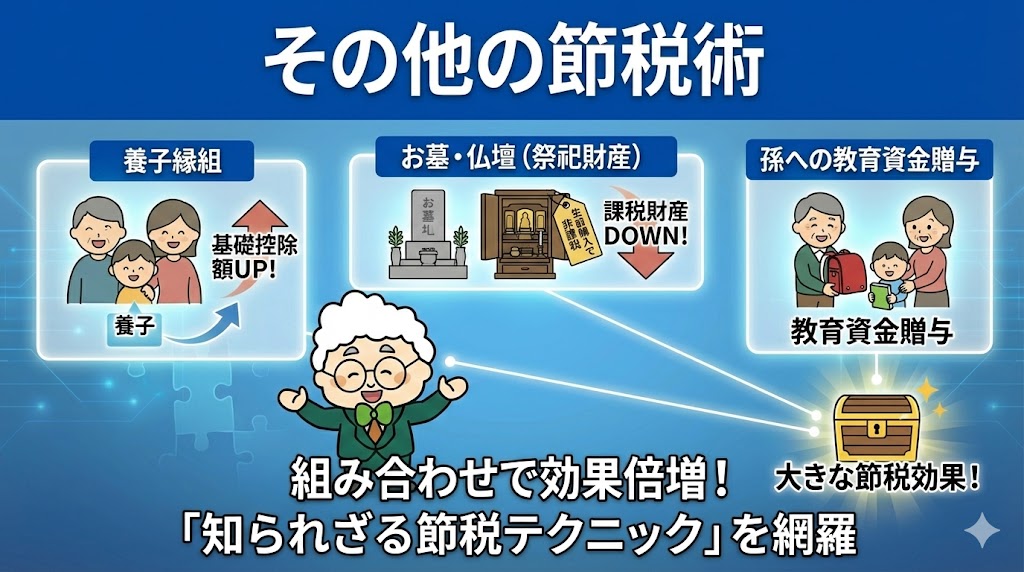 不動産や保険以外にも、相続税を減らす方法は存在します。「養子縁組」をして法定相続人を増やし基礎控除額を上げる方法、「お墓や仏壇」を生前に購入して課税財産を減らす方法(祭祀財産の非課税)、そして孫への教育資金贈与など。一つ一つは小さくても、組み合わせることで大きな効果を生む「知られざる節税テクニック」を網羅します。