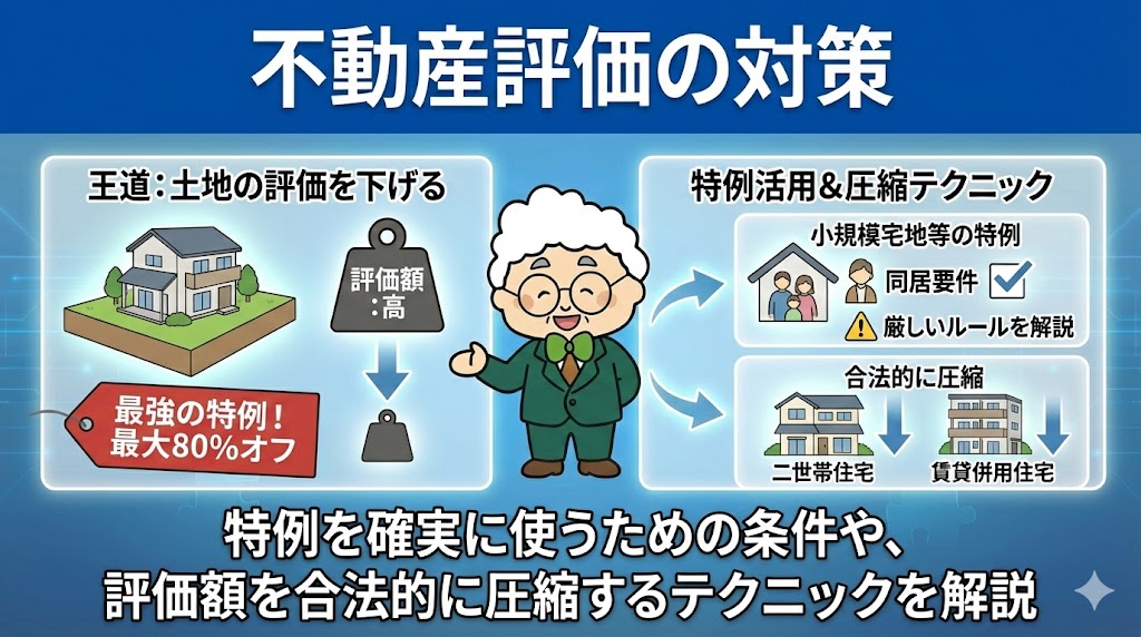 相続税対策の王道は「土地の評価を下げること」です。中でも最強の特例が、自宅の土地評価を最大80%オフにできる「小規模宅地等の特例」です。しかし、適用には「同居要件」など厳しいルールがあります。このカテゴリでは、この特例を確実に使うための条件や、二世帯住宅、賃貸併用住宅を活用して評価額を合法的に圧縮するテクニックを解説します。