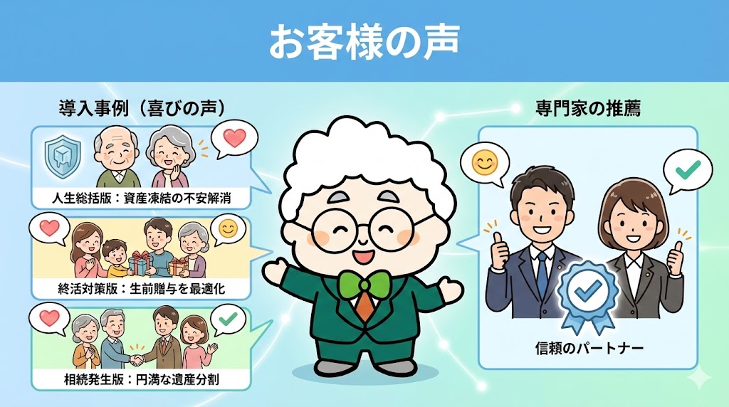 製品の価値を第三者の視点で証明し、導入の最後のひと押しをするカテゴリです。現行サイトの資産 を活用し、「人生総括版」で資産凍結の不安から解放された事例、「終活対策版」で生前贈与を最適化できた事例、「相続発生版」で円満な遺産分割協議ができた事例などを具体的に紹介します。また、税理士や司法書士といった「専門家のインタビュー記事」 を掲載し、専門的な信頼性を補強します。