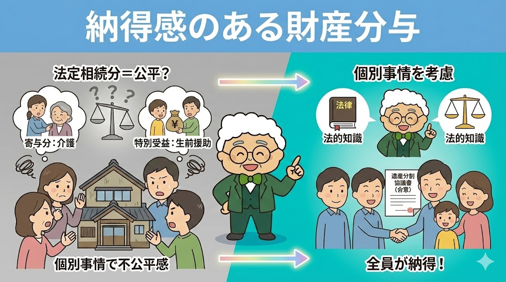 法律で定められた「法定相続分」での分割は、必ずしも「公平」とは限りません。例えば、「長年親の介護を一人で担った(寄与分)」「一人だけ生前に多額の援助を受けていた(特別受益)」 といった事情があるからです。このカテゴリでは、こうした個別の事情を考慮し、相続人全員が「納得」できる遺産分割協議の進め方と、法的な知識を解説します。