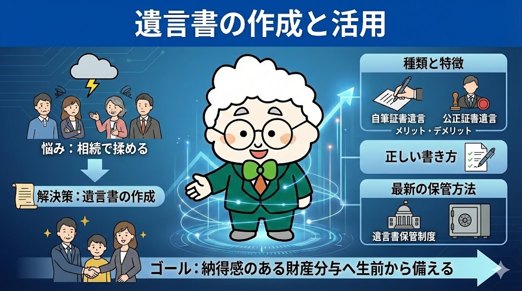 老後の悩み"の一つである「家族が相続で揉めること」を避けるため、遺言書の作成は不可欠です。このカテゴリでは、法的に有効な遺言書(自筆証書遺言、公正証書遺言など)の種類とメリット・デメリット、正しい書き方、そして「遺言書保管制度」など最新の保管方法までを解説します。これにより、「納得感のある財産分与」という悩みに、生前から備えることができます。