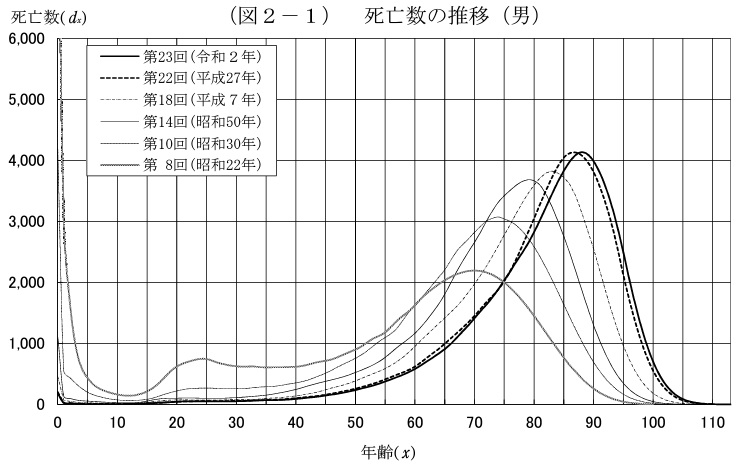死亡数:x歳における生存数lxのうちx+n歳に達しないで死亡すると期待される 者の数をx歳以上 x+n 歳未満における死亡数といいます。