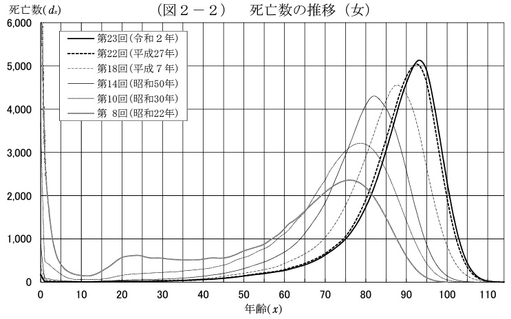 上記のグラフを見ると男性も女性も年々平均寿命が伸びています。男女それぞれの令和2年のグラフのピークを見ると、男性は87歳、女性は93歳位となります。